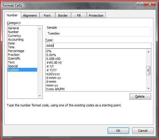En la celda B2, escriba = A2. Esto mostrará 01/01/1901. Luego con el cursor todavía en seleccionar el formato de la celda B2, formato de celdas, seleccione Personalizar y en el tipo: campo Introduzca dddd. Esto crea un formato de número personalizado para las fechas que indica el día de la semana.