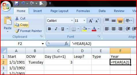 Saltar sobre la celda E2 (que te llene que más adelante). En la celda F2, escriba la ecuación = YEAR(A2). Esto tirará sólo el año de la fecha. Cuando presione Entrar en la célula debe decir 1901.