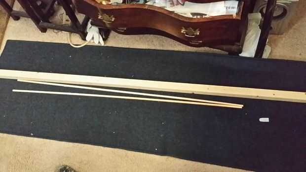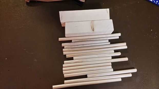 La estaca de madera sirve como el poste principal. Cortar a una longitud de unos 70". También cortar dos piezas de 6" de largo. Cortar la espiga en 6 y 8". Marcar el poste donde va a perforar. Comencé a 9 pulgadas de la marca top 1 en cada lado y repite cada 12 pulgadas. También marcó un agujero en el frente de 6 pulgadas de los orificios laterales y repite esto con cada marca de lado. Taladré los agujeros en un 40-60 grados ángulo 3/4 de pulgada de profundidad. Corte 2 piezas de 6 pulgadas de largo. Coincidir con la broca con el tamaño de la espiga para que la espiga puede caber fácilmente. Poner pegamento en cada hoyo antes de poner en cada espiga corte. Deje que seque durante la noche.