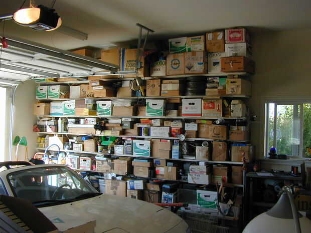 Otra cosa buena acerca de esta técnica es que acabados estante de tamaño casi ilimitado. Se muestra aquí es un conjunto de 14 pies estantes puse juntos antes de las 2 capas de chatarra madera contrachapada de 1/2". Los tableros de una sola pieza abarcan 32" entre soportes y, como veis, pueden llevar un montón de cosas.