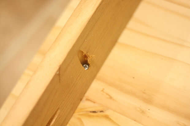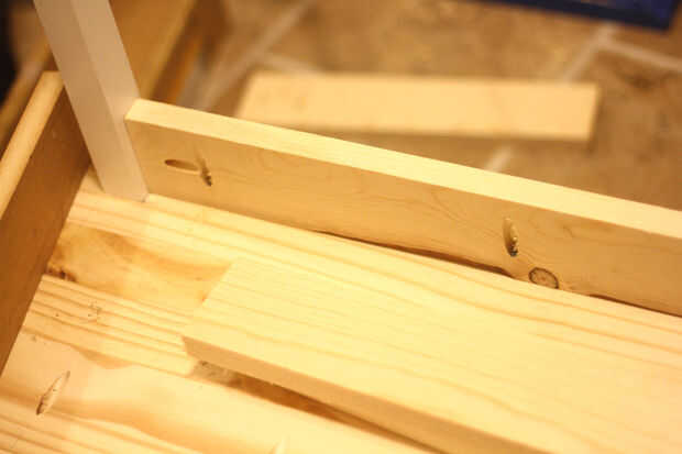 Seco encaja todas las patas en los agujeros y luego medir la longitud de las juntas de apoyo que usted necesita para cortar. medido desde el interior borde de una pierna a otra. Una vez que las piezas fueron cortadas a longitud taladré agujeros de ocultación en ellos. De cuatro en las piezas largas para enroscar en el tablero de la mesa y dos de las piezas más cortas. Cada pieza tenía los agujeros de bolsada perforados en los extremos para atornillar a las patas.