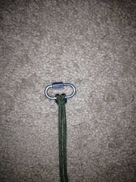 Primero garantizar el paracord a través del enlace rápido tomando los 2 extremos, plegándolas, entonces poniendo los extremos a través del enlace, tire el lado enrollado a través, tire firmemente.