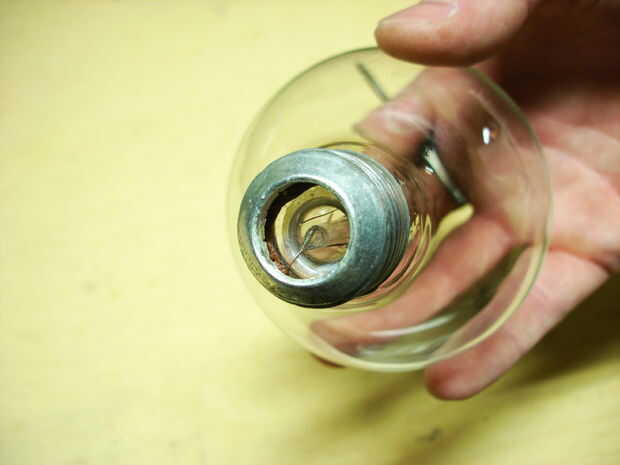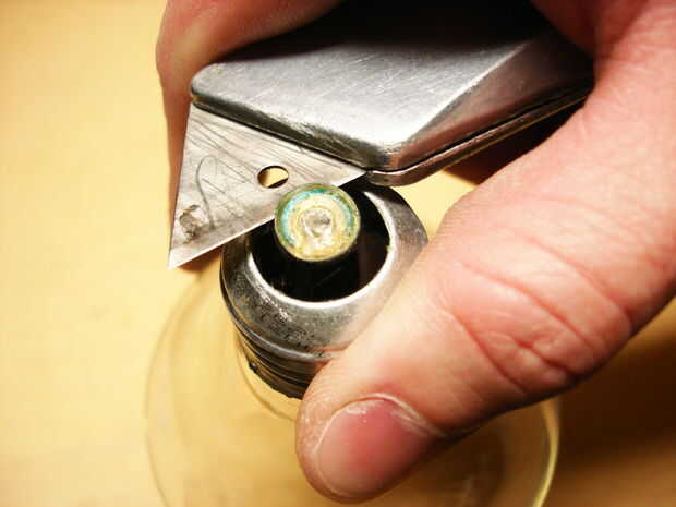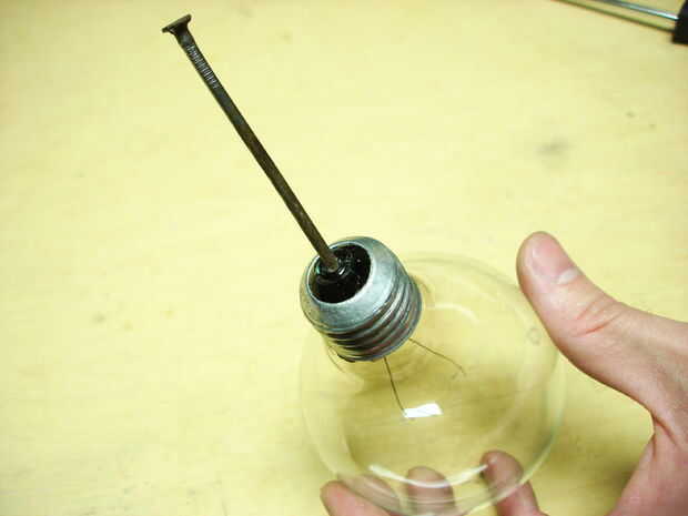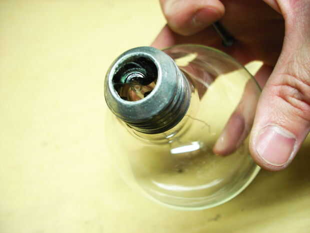 Luego usé un clavo para romper el vidrio oscuro en pedazos que usted puede necesita aguja nariz alicates si te está dando problemas.
