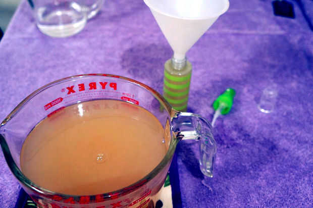 Usé un embudo para verter la mezcla en pequeñas botellas de plástico para usar mientras estoy de limpieza, bañarse o lavar mi pelo. Lo hago de esta manera porque esta mezcla tiene conservantes y se moldeará a menos que se mantenga en el refrigerador o congelador. Mantendrá 4-5 días en el refrigerador. Congelar cualquier que sobra después de 5 días por lo que no va a ir mal. Yo solo descongele lo cuando estoy fuera de mi fuente. Fuertemente sugiero que etiquetar sus botellas para que nadie los errores por algo de beber o comer. Tienda la fórmula en la parte superior de su refrigerador o congelador en un recipiente bien marcado, fuera del alcance de niños pequeños