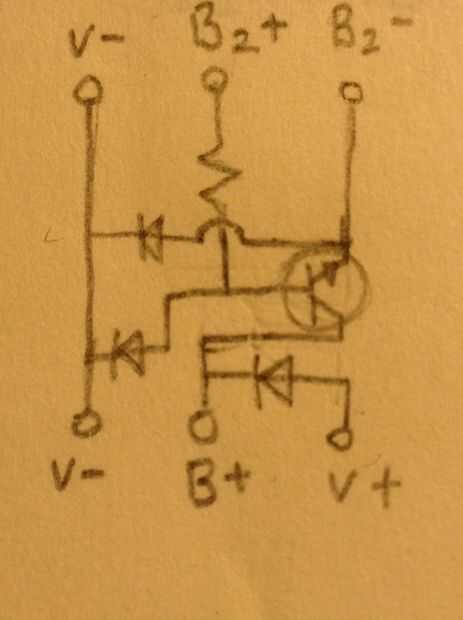 B2 es la conexión que alimenta el transistor. V y V - son las conexiones de carga. Como se indica a continuación, los diodos se ponen solo el final de los circuitos juntos: por ejemplo, si tuviera que añadir otro circuito a la parte superior, el diodo ser quitado de ese circuito y a la tercera conexión de circuitos.