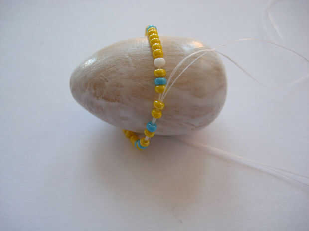Cadena de granos de la semilla en un pedazo de hilo.  Está tratando de medir el punto más ancho en el huevo, la "cintura" si se quiere.  Mantener ensartar perlas hasta que tenga el mayor múltiplo de 5 sin el filamento es más larga el la cintura.  Esto es la longitud de la fila más larga.  Asegúrese de anotar o recordar este número.
