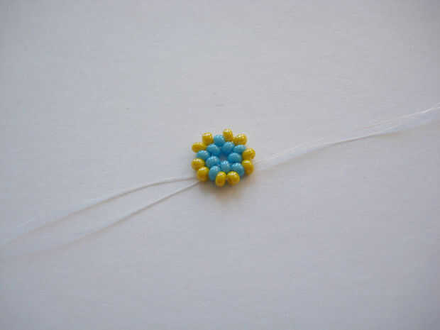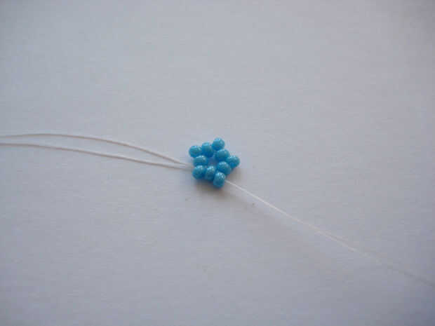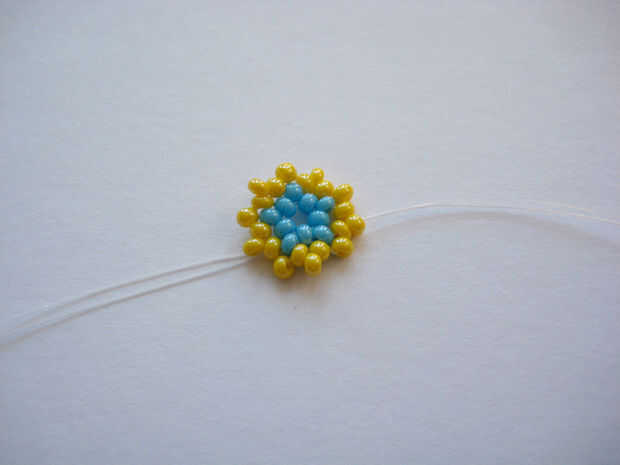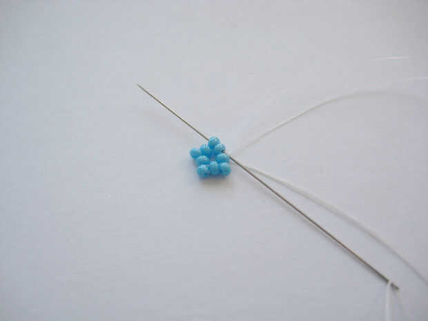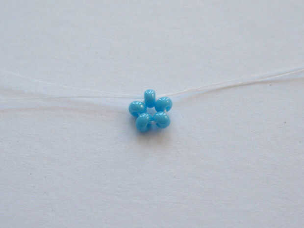 En esta fila, agregue una tira ir a través de un cordón y repetir hasta que hayas añadido granos de 5. Pasar por el primer grano que ha agregado para que la aguja está en el lugar adecuado para la siguiente fila.