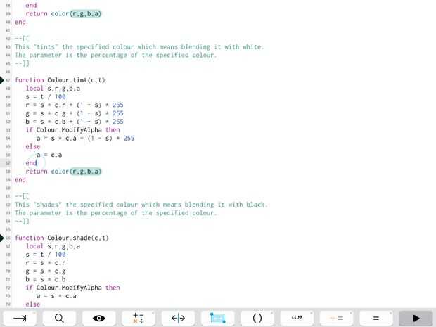 +=: Aguantando esto trae para arriba un menú entero de +=, =, / = y x = operadores. (Lua no tiene soporte para el conjunto ++,--, o += tipo de cosas, por lo que debe escribir var = var + 1 en lugar de var ++, pero constituye Codea para esto por lo que le permite escribir una variable y luego en lugar de escribir "= var + _" después de si, por el contrario puede pulsar este botón y Codea lo hará por usted. Esto es simple pero un poco difícil de explicar así que usted debe probarlo para usted escribir una palabra al azar y pulsando este botón).