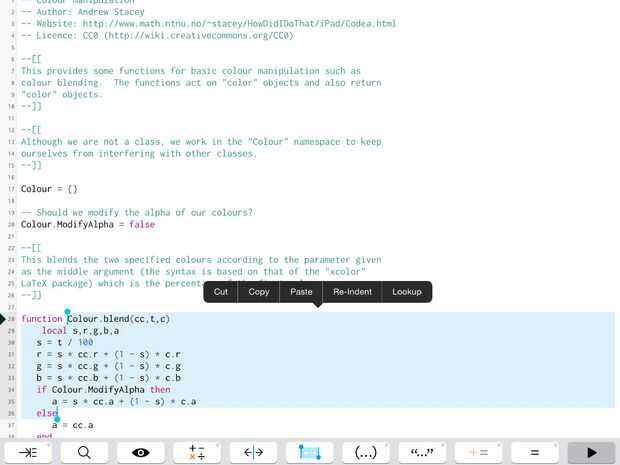 También hay algunas opciones que sólo se presentan junto a barra de copiar/pegar normal de Apple. Como se muestra en la figura 4, también existe la opción de volver a sangrar cuando se selecciona texto. Codea no es espacio en blanco sensible, hace el código ver más bonita. La opción que aparece es "Búsqueda" que abre el texto seleccionado en la referencia de sintaxis, si está definida allí.