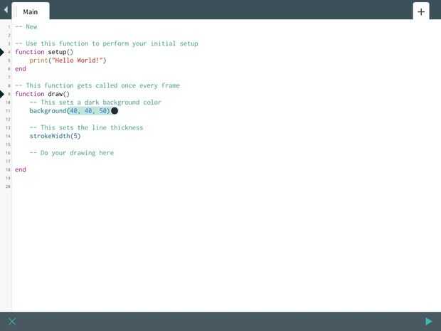 Después de lo que acabas de ver, su primer programa puede ser abrumadora un poco bajo. Para crear un nuevo programa, ir a la pantalla de título y haga clic en el botón +. Esto le pedirá un nombre para su proyecto, como se muestra en la figura 1. Introduzca un nombre, luego pulse crear. Esto abrirá la pantalla que se muestra en la figura 2. Como se puede ver, la gente agradable de izquierda vive dos ha hecho una pequeña programación para usted. Este es el clásico programa "Hello World", donde se escriben las palabras Hola mundo, A.K.A impreso, a la consola de salida como se muestra en la figura 3. Por supuesto, no estoy aquí para enseñar programación, pero te diré que esto se logra mediante el comando print(). Este es su primer programa. Para modificarlo, puedes probar jugando con el comando print(), lo que dicen diferentes cosas, o tal vez en movimiento en el sorteo de la función. Esto, usted notará, imprime las palabras una y otra vez. ¿Por qué es esto? Porque la función de configuración sólo funciona una vez, al principio del programa y se utiliza principalmente para la definición de las variables (que es fácil en Lua, que es tan alto nivel que las variables no necesitan el tipo definido y puede cambiar el tipo en medio de un programa). La función de drenaje, sin embargo, funciona una vez a cada fotograma. Esto puede ser 60 FPS, que significa todo en sorteo corre 60 veces por segundo, pero más probablemente (especialmente para programas complejos con gráficos en 3D) será un poco menos eso. Este es el editor de código.