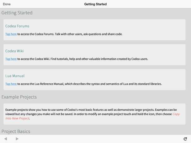 Para realizar programas más complejos, usted necesita saber, así... programa. Incluso si usted ya sabe algo hardcore de lenguaje como C o Java (bueno, no realmente esa base dura, pero en comparación con Lua?...) necesitarás saber Lua bien. Pero, ¿cómo puedo aprender Lua?"preguntarás. "Me alegro que preguntó," luego respondo. "¿Por qué es eso?" preguntarás. "Ya se Codea tiene uno de los mejores foros de la comunidad de cualquier programación IDE siempre!" Respondo fervientemente (Ok voy a dejar). Por supuesto, es sólo mi opinión, pero es realmente impresionante. Algunos de los programadores más experimentados quedarse allí y están encantados de responder cualquier pregunta que tengas. No pregunte a escribir código para usted. Una cosa es que no en cualquier foro de codificación. Ellos comparten su propio código, así que si quieres echar un vistazo a algunos de los mejores, vaya a la sección de "Código compartido" de los foros. Para llegar a estos foros, simplemente haga clic en el botón "Codea foros" en la pantalla principal de Codea, o google foros Codea. Los foros solos, sin embargo, no le enseñará Lua. Tomará tiempo y horas de poring sobre la documentación en la aplicación que me encanta tanto (otra vez, el botón poco vista en el editor de código). También hay muchos otros recursos que puede utilizar, como la Codea Wiki. Para encontrar otros recursos, basta con mirar en la sección que comenzó en los ejemplos de Codea. Será la primera de ellas. La pantalla que aparece se muestra en la figura 1. Le deseo buena suerte en tu viaje a grandeza de Lua. Como nota final sobre el tema, hay muchos grandes libros que se encuentran en Lua. Mi favorita es "aprender Lua para iOS juego de desarrollo" por Jayant Varma. Incluso tiene una sección sobre Codea! Una vez más, buena suerte. Espero a ver lo que te ocurrió en el futuro.