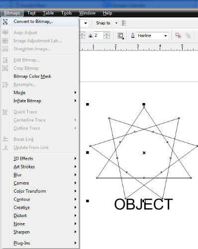 Si tienes un objeto (tal vez algún texto o un conjunto complejo de formas que has creado) se puede convertir a mapa de bits seleccionándolo y luego el mapa de bits -> convertir a opción de menú de mapa de bits (ver imagen). Asegúrese de tener todo lo que quieras se puede convertir seleccionado cuando haces eso.