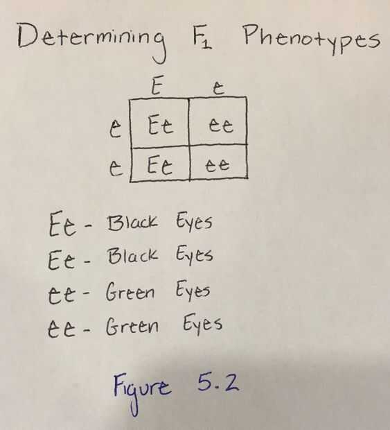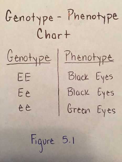 2. A continuación, usando la tabla en la figura 5.1, escriba el fenotipo esperado al lado de cada genotipo en su papel. (Ver figura 5.2)