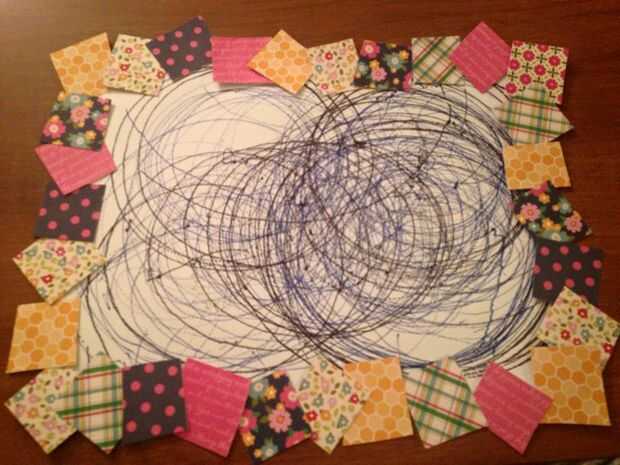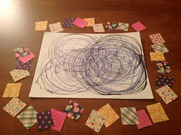 Una vez que todos los de su corte cuadrados, organizarlos alrededor de su obra de arte en un diseño que es atractivo para usted. Entonces, les extendió alrededor de la obra de arte en el orden que tenía; por lo que es más fácil recordar dónde estaban y cómo usted pegamento abajo.
