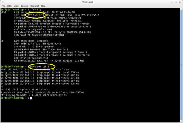 Tengo dos trozos de círculo de la información en mi imagen. La primera es la dirección IP de la computadora que estoy trabajando en. (Esto es siempre buena información) y la segunda es la dirección IP de lo que hecho un ping. ¿Me pillas ping de mi router inalámbrico? Buenos ojos! Ping el router, así como ver si contesta. Generalmente es.1