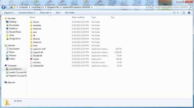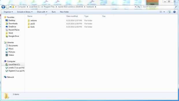 Desplácese a la carpeta MPIDE en la carpeta archivos de programa. Luego abrir "hardware". En el interior verás tres archivos "arduino", "pic32" y "herramientas". Si desea trabajar con una placa Arduino, abriría "arduino", pero ya que vamos a trabajar con chipKIT juntas, abrimos "pic32".