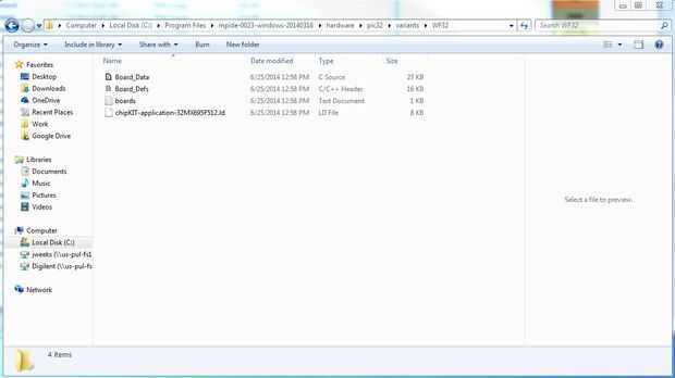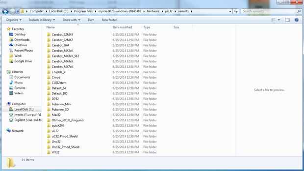 Abrir "variantes" para ver las carpetas de todos el chipKIT diferentes tableros que usted puede programar con MPIDE y abrir la carpeta para el suyo (abrí WF32).