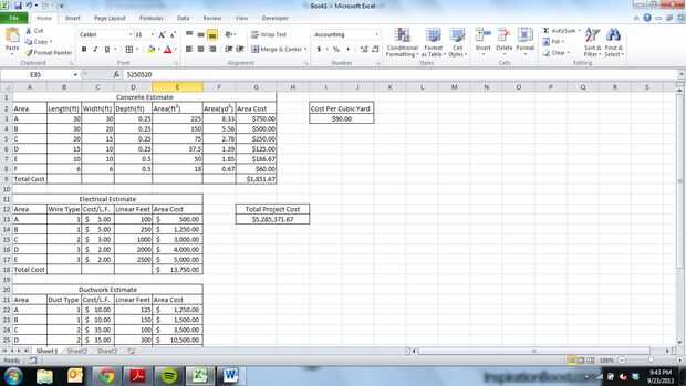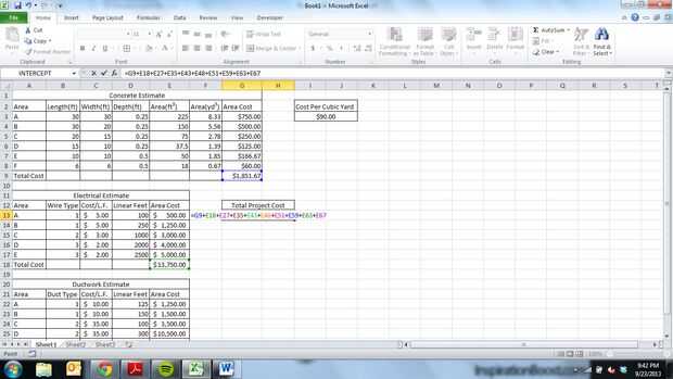 Para este ejemplo he creado otras tablas similares pasos 1-10. Ahora quiero añadir juntos para hacer uno costo del proyecto. Utilizando la función suma en este caso es posible, pero no tan funcional como antes. Puesto que está recopilando datos de todo la hoja de cálculo que tendrá que haga clic en cada celda de todos modos, así que simplemente añadiendo hasta es igual de fácil. Para ello he fusionarse algunas células y creado una pequeña tabla con el título, el costo Total del proyecto. Ahora con funciones similares como antes Pulsa el signo igual (=) en la celda que donde desea que comience la función. Ahora haz clic en el costo total para cada subcategoría (es decir, concreto, eléctricos, conductos, etc.) con un signo de adición (+) entre cada uno, como se muestra arriba. Luego oprimir la tecla entrar voluntad revelar el costo total del proyecto (o lo que sea total el cálculo). Hay un sinfín de opciones de ecuaciones, fórmulas, gráficos y tablas de que se pueden utilizar a través excel, este fue uno de los conceptos básicos que me encuentro utilizando a menudo.