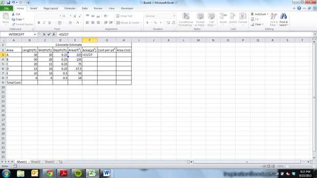 En mi ejemplo se trata de hormigón. Concreto se calcula normalmente en yardas cúbicas. Sin embargo hice mis medidas en pies. Por consiguiente, mi zona es en pies cúbicos. Para convertir esto debemos dividir los pies cúbicos por 27 a yardas cúbicas. Otra vez podemos utilizar la función fórmula para obtener estos números. Simplemente golpear el signo igual, seguido de clic en el área que lo a solucionado, y dividir (/) en 27. Entonces usted puede copiar y pegar esta fórmula en las celdas de abajo.