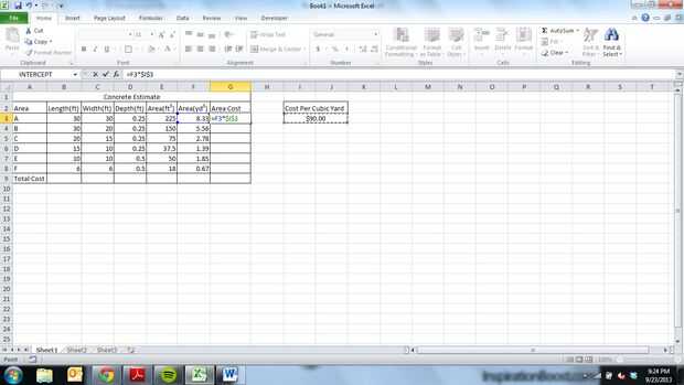 Ahora calculamos el costo del área multiplicando el área por el costo unitario. Así que una vez más hacemos clic en la celda que queremos la información publicada en. Luego el signo igual (=) seguido de clic en la celda de Area(yd3) y el costo por yarda cúbica de la célula. Ahora esto funciona para la fila superior de los datos, sin embargo si copiar y pegar los datos abajo cualquier celular por debajo de la primera no tiene los datos correctos. Esto es porque, de nuevo, Excel utiliza referencias de celda para determinar cualidades. Para solucionar este problema debemos utilizar una referencia absoluta. Para utilizar una absoluta referencia destacar la referencia que desea seguir siendo el mismo (costo por yarda cúbica, celda I3 en la fórmula) y pulsa F4. Esto debe traer por signos de dólar ($) en la fórmula, como se muestra en la segunda foto de arriba. Ahora puede copiar y pegar la fórmula hacia abajo y va a trabajar para cada célula.