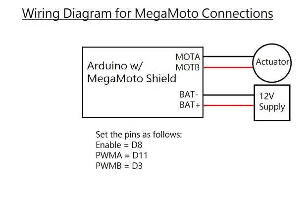 Ahora que hemos probado diferentes entradas, podemos ver cómo salidas se pueden utilizar en las declaraciones de switch() así. Usaremos la MegaMoto para controlar un actuador para extender y retraer. Este ejemplo es similar al primer ejemplo, solo estamos utilizando retardos.