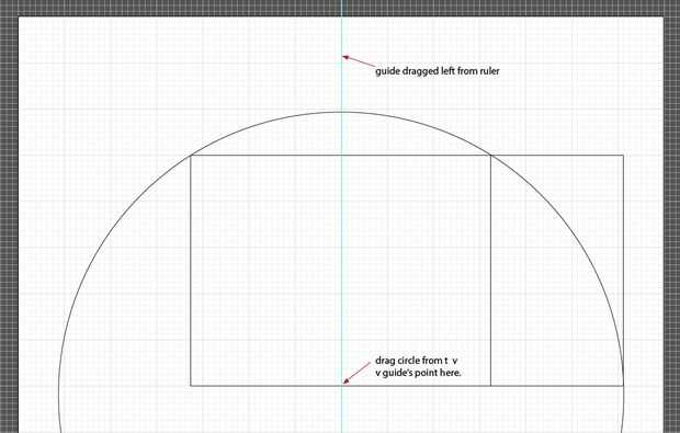 Luego dibuja un círculo (l) desde el punto de centro de la parte inferior de la guía, presiona las teclas ⌘ y ⌥. Arrastre el círculo para que su frontera toca las esquinas superiores de ambos la Plaza. Este es el círculo vamos a utilizar como una guía para descifrar la proporción de oro.