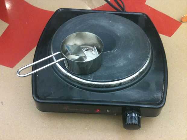 • Coloque el estaño en su taza, la taza de medir en su placa caliente y active el (el estaño derrita alrededor 400 F dependiendo de la aleación específica).