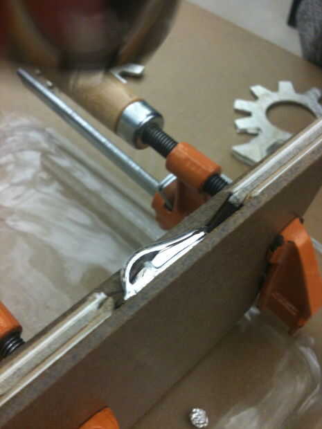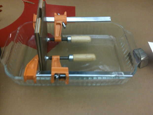 • Sándwich molde tablero mate capas entre el 6 "x 6" piezas de tablero plano (madera contrachapada o MDF) y segura sujeción con abrazaderas en c al menos 2. Coloque este conjunto hacia arriba en una bandeja de algún tipo (hoja de pyrex o de la hornada).