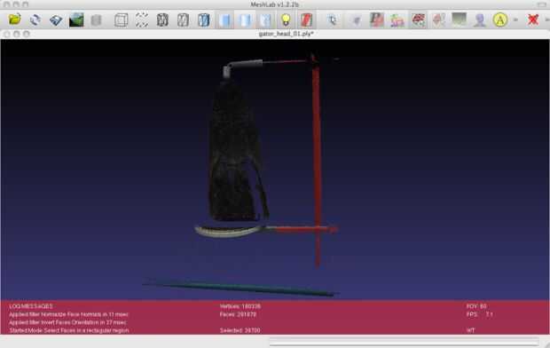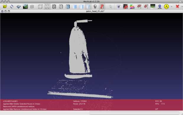 filtros, selección o eliminar seleccionados caras y vértices para eliminarlos. Esto no sólo elimina las caras, pero también elimina los datos subyacentes de punto, dando por resultado un un filtro de malla y tamaño de archivo más pequeño. Repita este paso para cada exploración y es útil guardar el archivo limpio como una nueva versión, dejando el original intacto. Guardar a menudo!