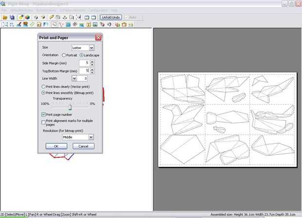 Así que una vez que tengas todas las piezas dispuestas, es tiempo para un último detalle. Haga clic en "Archivo", a "Configuración de la impresora" y cambio de orientación del paisaje. Sólo para asegurarse de que usted tiene este derecho, "Vista preliminar" Echa un vistazo. como todas las piezas parecen todo, has hecho bien. Tiempo para imprimir! (Si PD2 dice "una parte del desarrollo no puede caber en el área de impresión" y pide a escala, haga clic en "No")