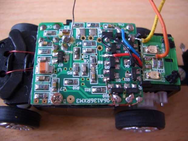 El receptor es más complejo. Necesito algunas salidas de conmutación. La parte más fácil son las dos bobinas que cambian la dirección que conduce. Hilos finos de cobre se sueldan a la placa y llevan a las bobinas. Los dos transistores que cambiar las bobinas llevan el código SMD 1 P. Buscando por internet me enteré que estos transistores son NPN del tipo MMBT2222A. Pensando en circuitos de conmutación estándar supuse que los transistores están conectados a tierra con las conexiones del emisor y que las bobinas están conectadas directamente a VCC. Alguna medida en el PCB confirmó que. Lo único que hacer es conectar unos LED a las salidas de conmutación.