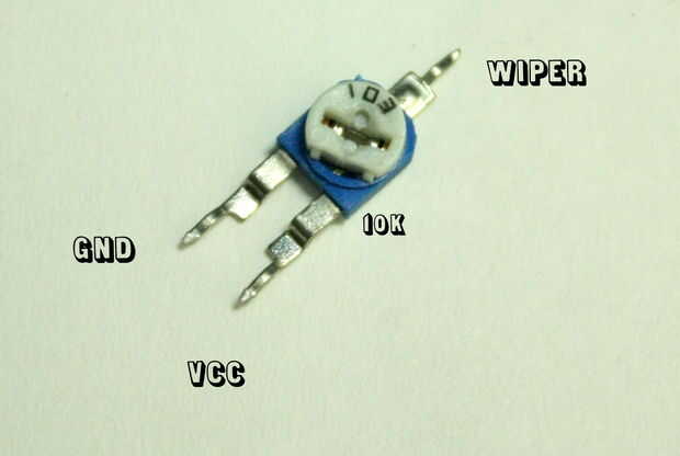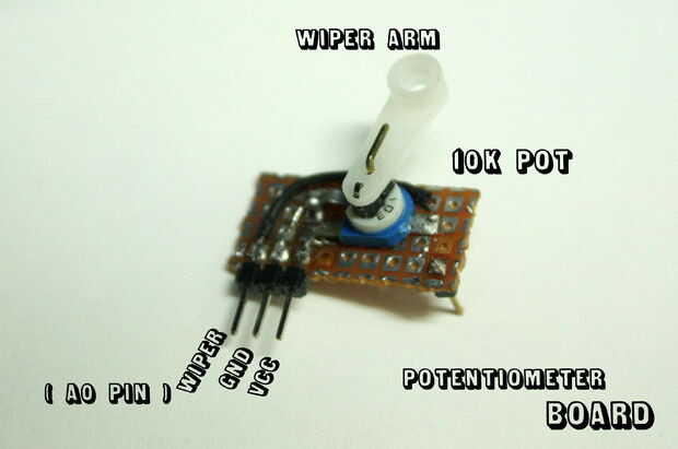 El potenciómetro tiene tres pines uno es para el limpiaparabrisas y los otros dos tienen resistencia de 10 k entre ellos. El limpiador debe conectarse al pin analógico 0 en arduino, una de las dos clavijas restantes debe conectarse a + 5v y el otro deben estar conectada a tierra. El potenciómetro ha sido soldado en un protoboard para que sea "arduino amistoso" ( que también puede usar un protoboard ).