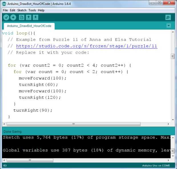 He escrito el código que se encarga de todos los detalles del funcionamiento de los motores paso a paso y proporciona los comandos simples para mover y girar. Descargar el sketch de Arduino adjunto y colocarlo en la carpeta de sketch de Arduino. Luego ábrelo con el IDE de Arduino. Puede pedir colocarlo en una carpeta nueva, que está bien.
