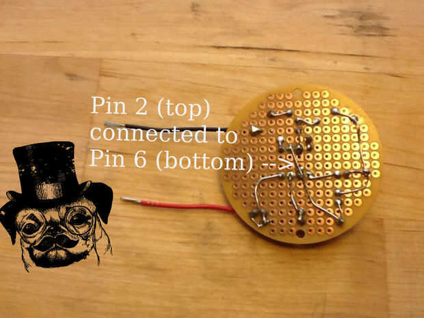 Punta: Conecta el pin 2 al pin 6 puede ser un poco complicado. Un truco es conectar los pines 2 y 6 de la parte inferior con un cable que es cortado antes (ver foto).
