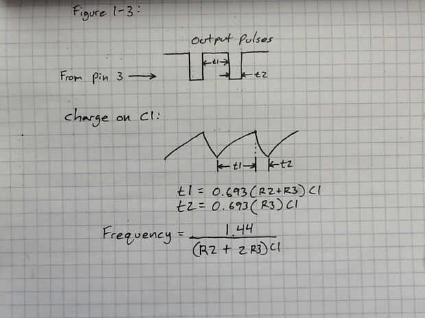 Puede cambiar la frecuencia (que es la velocidad comenzará a parpadear el LED) experimentando con capacitores y resistencias diferentes. Cambiar los valores de R2, R3 y C1 va a cambiar la frecuencia de pulsos de salida que sale del pin 3. Cambiar los valores de R2 y R3 se efecto la duración del ciclo en . Cambiar el valor de R3 sólo voluntad cambió la duración del ciclo de apagado . Puede utilizar la fórmula que se muestra en la figura 1-3 para calcular la frecuencia deseada.
