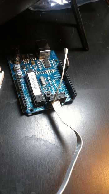 He perforado los otros cables y cortarlos al ras. Puse un poco de pegamento en ambos lados del cable de cinta para tratar de evitar de partir por el cable más. en el extremo de la patilla de reset (5 cables) puse un conector macho en él por lo que encajaría en la clavija hembra 10 para la programación.