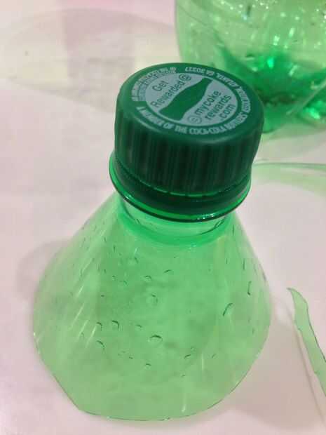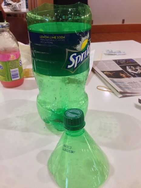 Cortar la botella como se muestra en la imagen. Mantener el la tapa y una pequeña parte del cuerpo de la botella (como se ilustra en picure). Luego use el cuchillo para elaborar su trabajo, hacer el filo liso, para evitar que se corte a sí mismo.