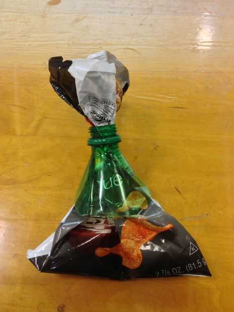 Deje que la bolsa vaya a través del orificio de la botella de plástico, expulse el aire de la bolsa.