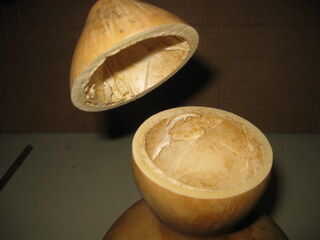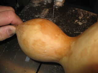 Mancha, barnizar o pintar la calabaza quieras. Hay un montón de sugerencias on-line pero dejé mi llano. Evitar poner cera etc. en el centro de la parte inferior donde va el pegamento.
