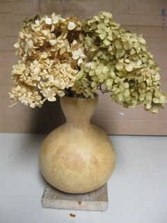 Ahora a organizar una gran variedad de pastos secos, malezas, flores (reales o imitación) en su base natural. No ponga agua dentro de la calabaza para flores frescas.