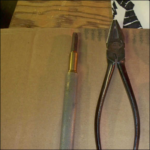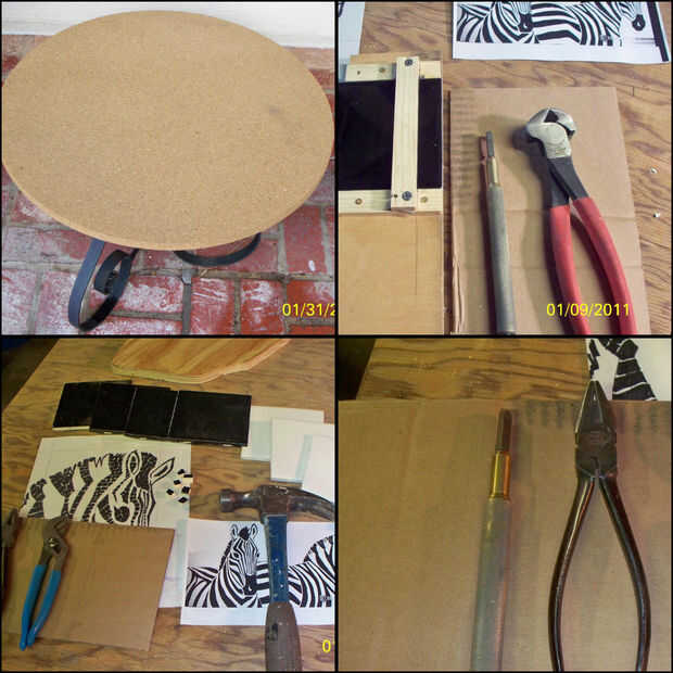 Utilicé robaban materiales tenía por ahí, un aglomerado de 19 pulgadas redondo una pieza de una mesa de saldos, las fichas de campo, por supuesto, y algunos izquierda sobre adhesivo, algunas boquillas, etc..  Herramientas necesarias estuvieron así, pero los pedazos principales son las pinzas del azulejo, el cortador de vidrio, y diversas herramientas como un martillo (para romper azulejos), pinzas para sujetar los azulejos mientras se rompe después de anotar, una guía de puntuación para marcar líneas de azulejos antes de romperse y la lechada habitual mezcla de herramientas; esparcidores, esponjas, baldes, etc.. Usé un proyector opaco a copiar mi trabajo de arte sobre la mesa. También utilizo una herramienta dremel con broca de diamante para moldear varias piezas según sea necesario. Ojo nota que es una sola pieza, redondeado con dremel.