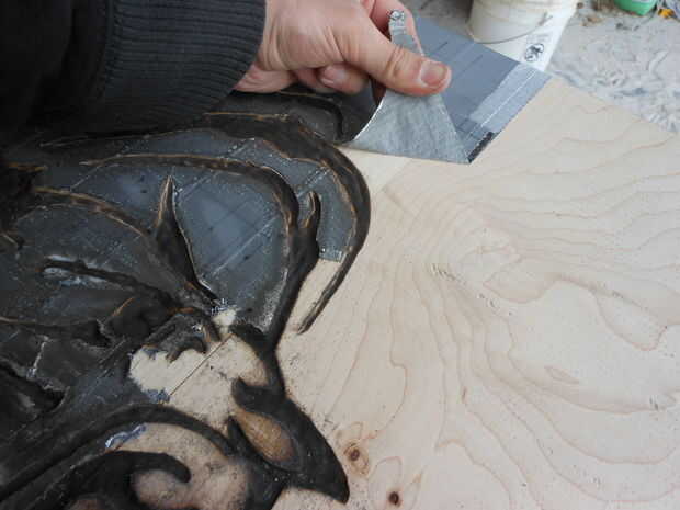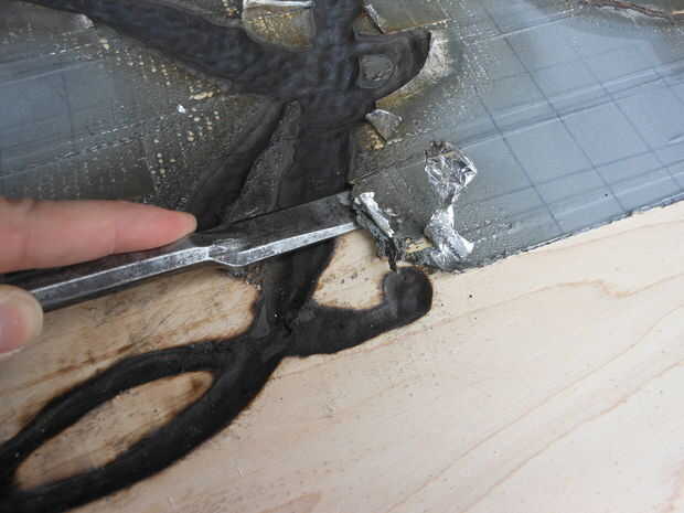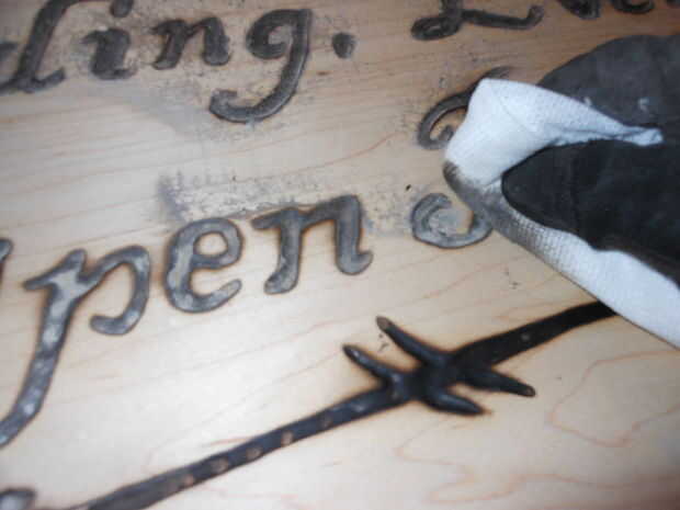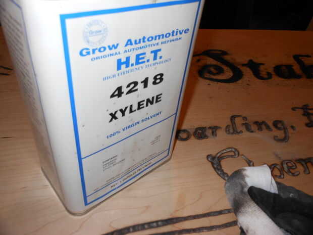 Quitar capas de cinta y los residuos restantes. Tuve que usar un cincel para raspar el pegamento derretido la mayoría de los bordes, pero salió muy fácil. El pegamento derretido izquierda un residuo muy pegajoso a lo largo de los bordes que me salió muy fácilmente con xileno. Usted necesita tener cuidado de no tirar el carbón de las Letras con el disolvente en su madera de color claro. Usted puede borrar cualquier mancha con un paño limpio, sin embargo, el carbón de leña se asentará en los poros e irregularidades de la madera. Por esta razón se necesita una superficie lisa agradable antes de comenzar y una madera de grano cerrado.