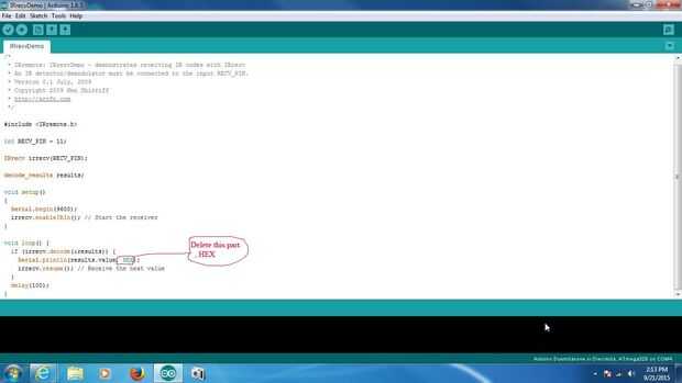 Ahora que tienes el circuito construido su tiempo para asignar el control remoto. La primera cosa a hacer es abrir el IDE de arduino y luego ir a ejemplos y abrir IRrecvDemo. Después de que lo tienes abierto ir abajo el código hasta encontrar la línea que está en un círculo en la foto de arriba y borrar el (, hexagonal), la razón para hacer esto es porque será easer para trabajar cuando está escribiendo el código. Usando números HEX complicará las cosas a menos que usted realmente bajo soporte cómo utilizarlos al escribir su sketch de arduino.