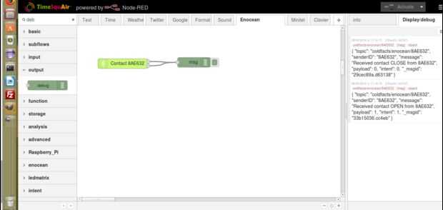 la puerta o ventana. Con el depurador, el mensaje será: {"tema": "coldfacts/enocean/8AE632", "senderID": "8AE632", "mensaje": "Recibido contacto cerca de 8AE632", "carga útil": 0, "intención": 0, "_msgid": "fd328bc9.02cd78"}