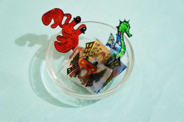 El paquete de Shrinky dink sugieren utilizar una bolsa de papel para evitar que el plástico se pegue a la sartén pero encontré trabajos de lámina de aluminio mucho mejor.