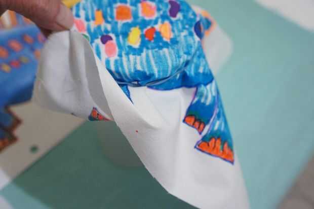 Si te gusta el look de tinte de corbata puede hacer esto colocando la tela sobre un vaso de plástico y atar una banda elástica alrededor del borde superior del vaso para asegurar a la tela. Este método hará que se difunda la tinta. Después de tener la tela en su lugar, llenar el gotero con alcohol y deje caer una gota sobre la sección pintada. Los colores de la pintura se mezclan y darle una mirada de tinte de corbata única. Cuando esté satisfecho con el diseño después de que sea seco, sistema de calor la tela con la plancha como describí anteriormente.