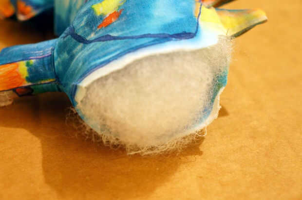 Pensé que era más fácil empezar rellenando los puntos usando sólo una pequeña cantidad de relleno de fibra y un palillo de la tajada y un lápiz con una goma de borrar. Los fabricantes de la muñeca con una herramienta especial que utilizan para áreas estrechas; Creo que tiene un gancho en el extremo de él, que hace más fácil agarrar el relleno. El relleno es algo resbaladizo y es difícil de agarrar para levantarse en los puntos. Cosas del animal hasta que estés satisfecho con la apariencia. Cerrar el extremo con una aguja e hilo como se muestra.