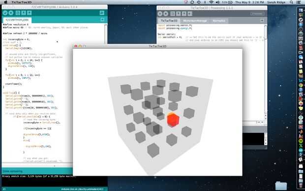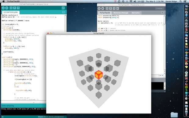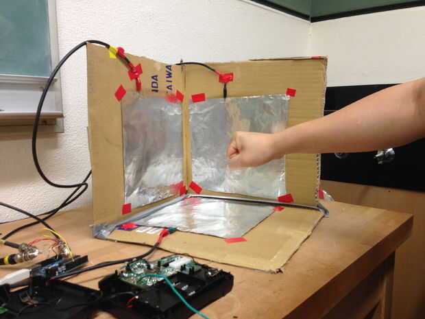 Este seguimiento no será perfecto, especialmente hacia los bordes del cubo (probablemente debido a los campos marginales del condensador.) Sin embargo, al trabajar con cables blindados, asegurándose de que nada está en contacto eléctrico, y seleccionar un buen valor para el tamaño de las placas y las resistencias, deben ser capaces de mejorar la respuesta del sensor. Experimentar con esto! Trataron de unos tamaños de placa y se establecieron en cuadrado de 8 pulgadas, pero el camino lo hicimos distaba mucho de ser cuantitativa. No disponemos de tiempo para probar otros valores de resistencia. Recuerde que cuanto mayor sea el valor de la resistencia, menor el tiempo de carga o descarga. No estamos seguros cómo esto afectará la exactitud de las lecturas, aunque mi primera conjetura sería que tiempos más largos de descarga conduciría a una más precisa pero más lenta para responder a medida.