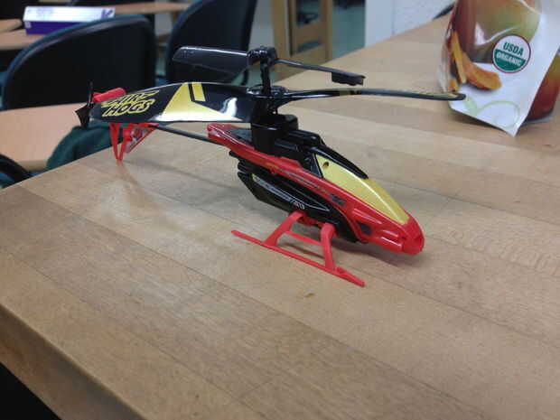 El helicóptero se mantiene en el aire haciendo girar sus rotores en una frecuencia determinada, que puede ajustar para hacerlo ir más alto o bajar presionando una palanca de mando. ¿Pero quién quiere presionar sobre una palanca de mando cuando se puede usar la fuerza?