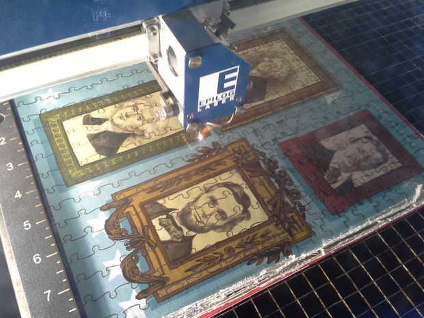Con cuidado deslizando una pieza de chapa bajo el corte terminado, levante el rompecabezas terminado, todo de la cama de corte. Sándwich el rompecabezas con la tapa y voltee la como entera, completa rompecabezas.